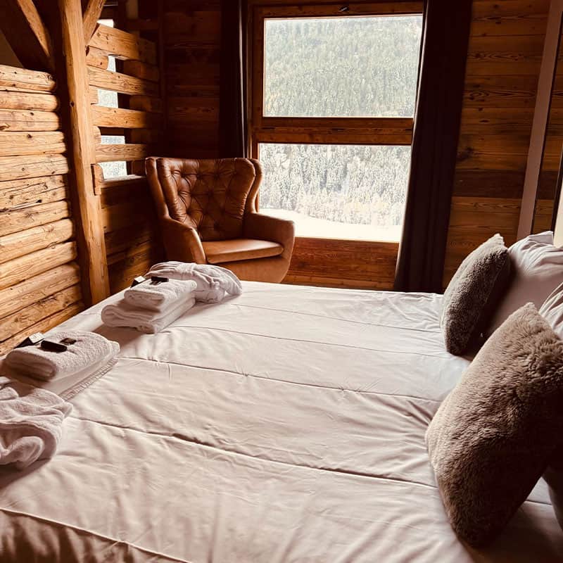 The chalet features four beautifully appointed en-suite bedrooms, each thoughtfully designed to showcase ancient timbers alongside sweeping alpine views. All equipped with towels, robes, hairdryers and complimentary toiletries.