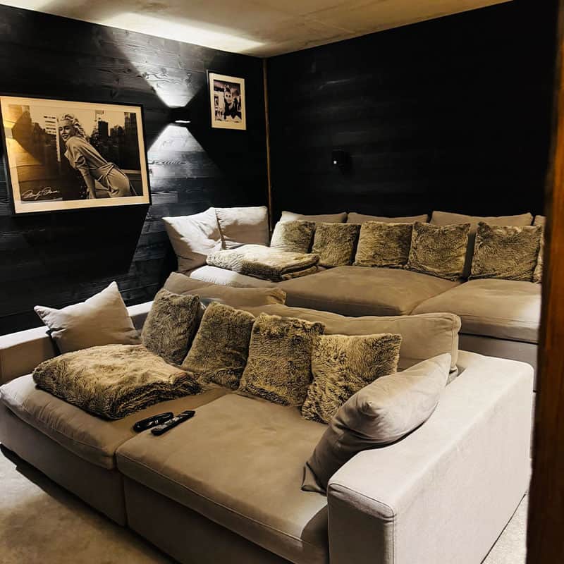 The cinema room is equipped with a 65-inch OLED television, surround sound system, streaming channels and PlayStation all to be enjoyed from elegant two-tier seating.